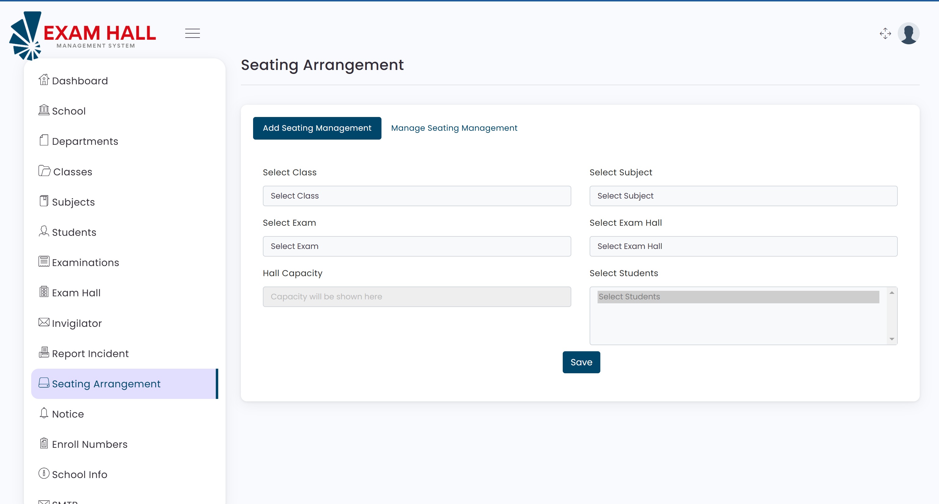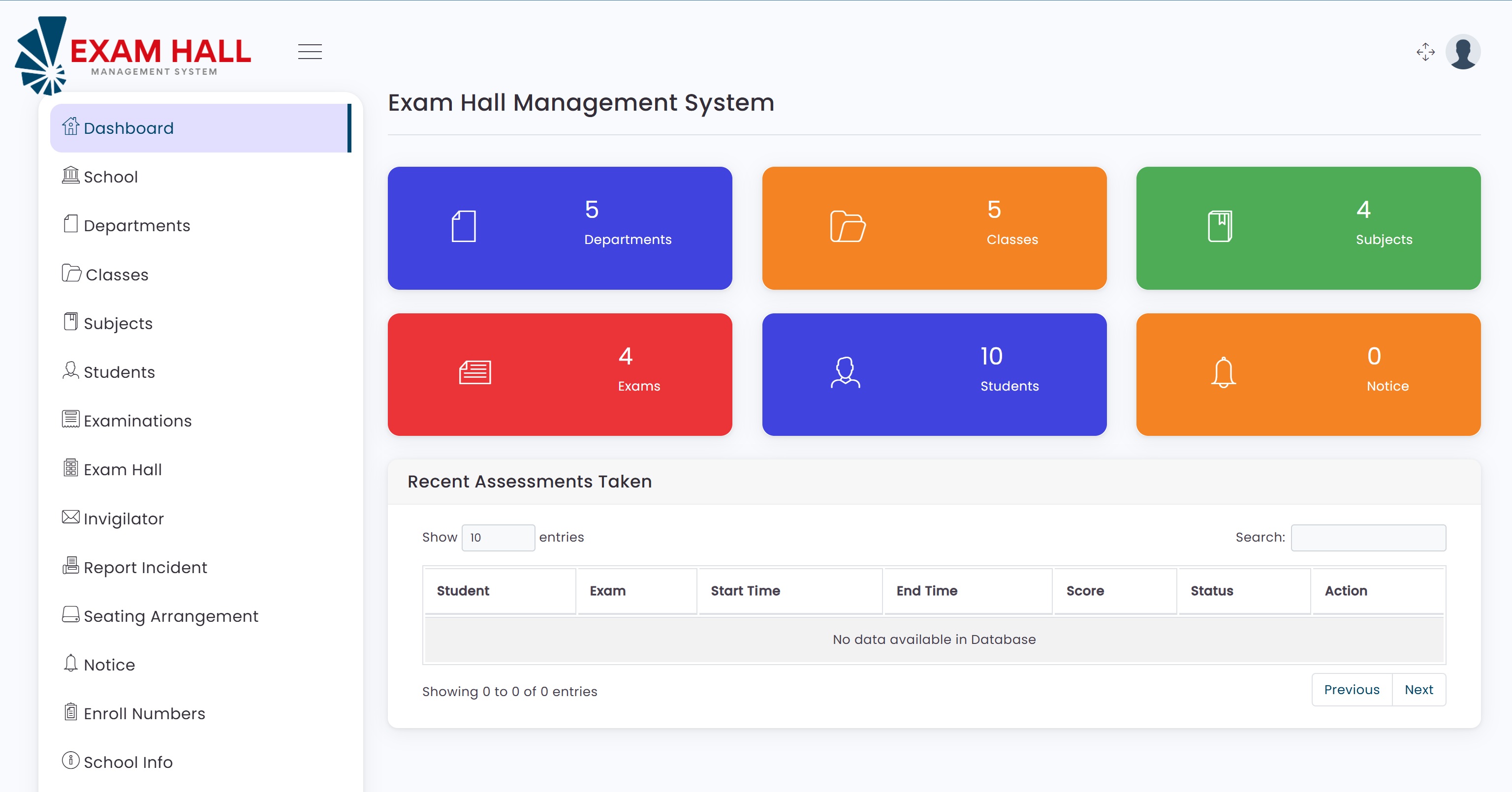 The Exam Seating Arrangement Software empowers administrators with an intuitive and reliable platform to manage exam seating efficiently while ensuring a secure and organized testing environment.There are having features like Dashboard, school, departments, classes, subject, students, examination, exam hall, invigilator, report incident, seating arrangement, notice, enroll numbers, school info and SMTP etc.